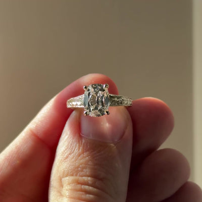 This 2.14 carat, VS1 old miner cut lab grown diamond is set into a 14k yellow gold setting with hand engraved detailing on the band. This setting has a large finger presence and tapers to a comfortable 2mm band as it reaches the finger.